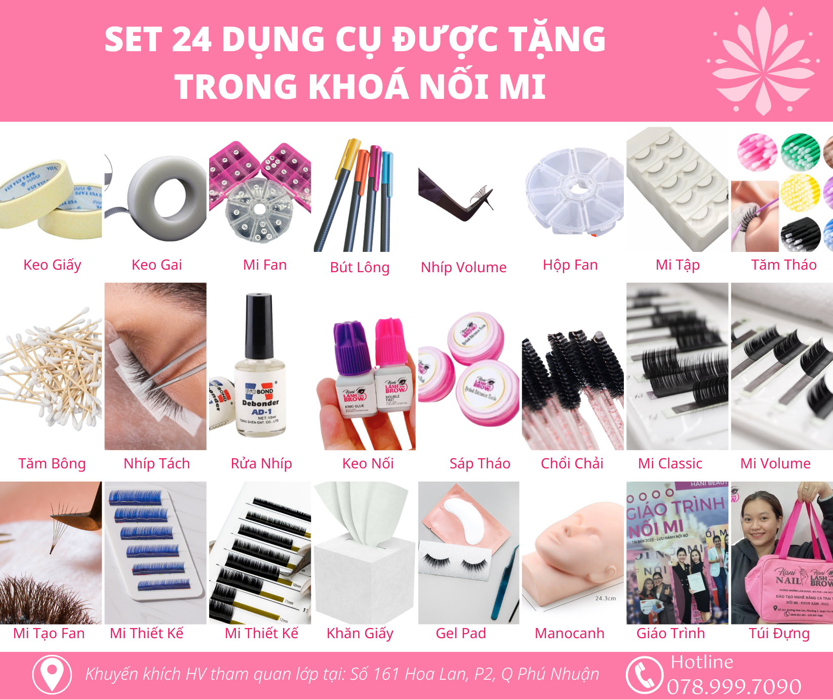 - Tặng combo đồ nghề trị giá 3 triệu đồng (keo, nhíp Japan, 15 khay mi, đệm mắt, gỡ keo).